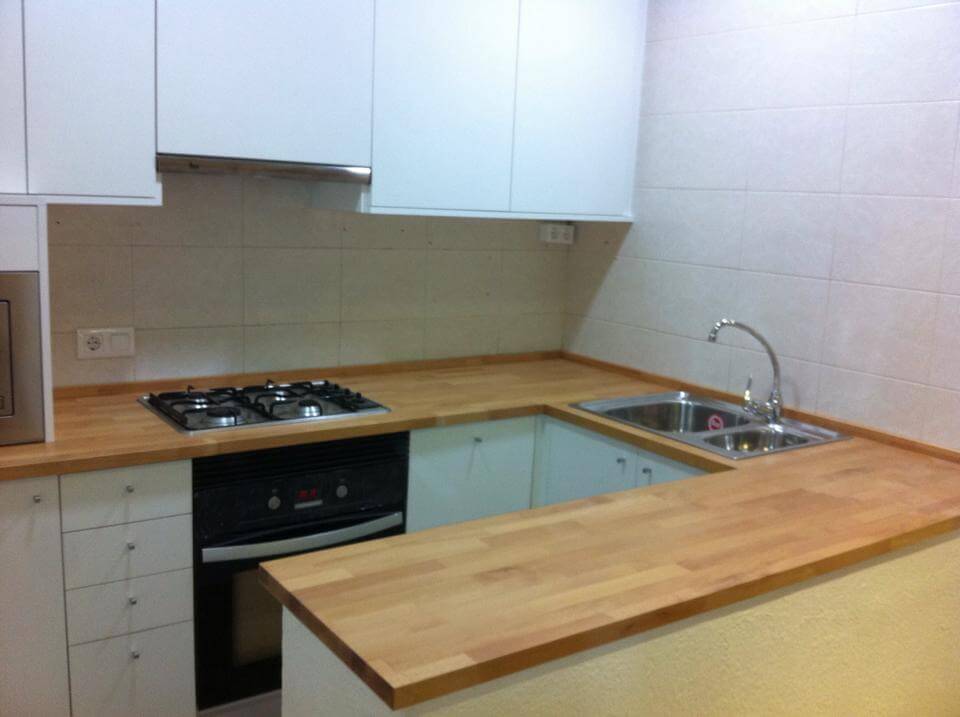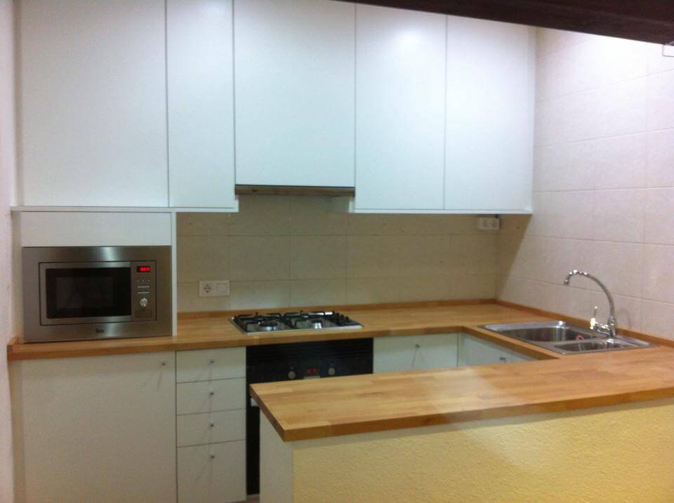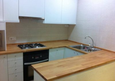Este proyecto muestra la posibilidad de unos acabados en madera blanca lacada. Se trata de una cocina con encimera de madera acompañada por muebles blancos.